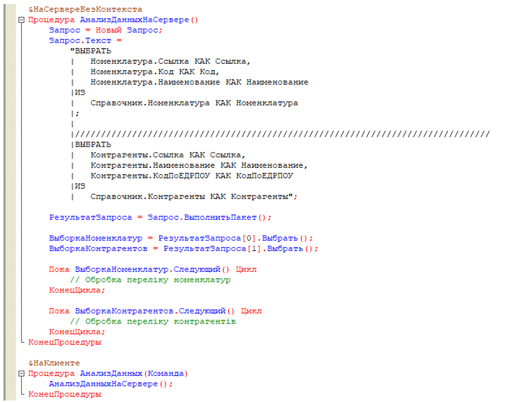 Приклад. Припустимо, що розробляється обробка, в якій необхідно отримати елементи довідника «Номенклатура» і довідника «Контрагенти», а отримані переліки елементів опрацювати окремо.